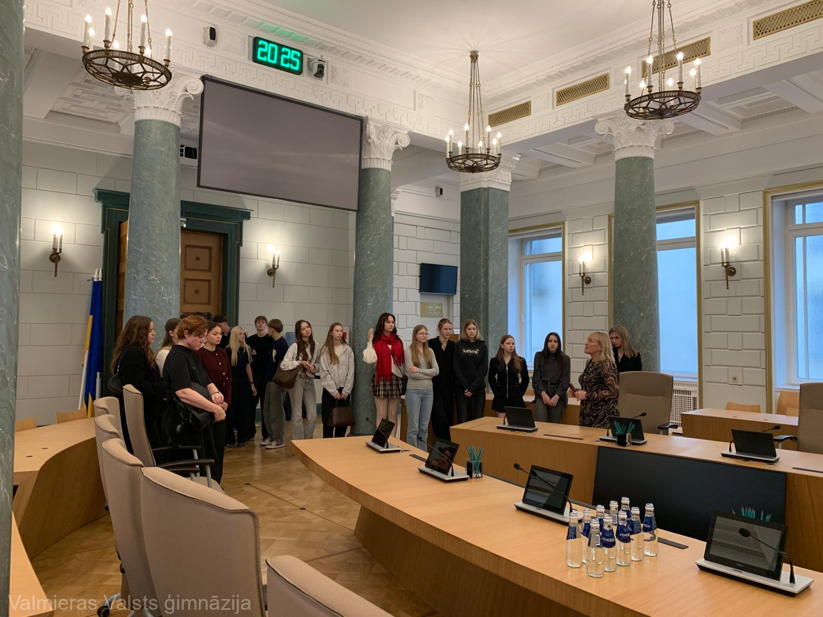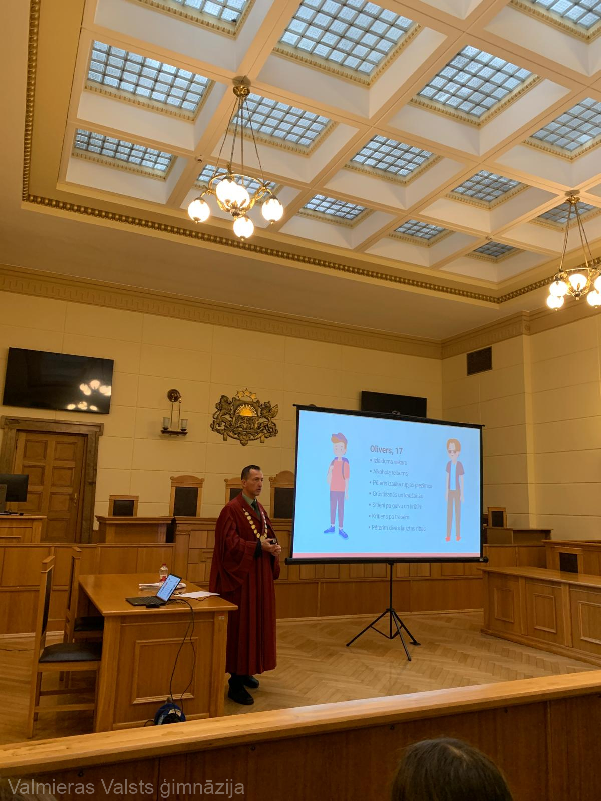 Jauno juristu skolas dalībniekiem šajā mācību gadā pirmā izbraukuma nodarbība notika Latvijas Republikas Senāta galvenajā sēžu zālē. Nodarbību vadīja Krimināllietu departamenta senators Māris Leja. Viņš iepazīstināja jauniešus ar tiesas un tiesneša darbu, stāstījumu paspilgtinot ar konkrētiem piemēriem no savas jurista prakses. Skolēni risināja arī Senatora piedāvātos juridiskos kāzusus no jauniešu dzīves. Pēc tam Senāta preses sekretāre Baiba Kataja izveda jauniešus ekskursijā pa Senāta vēsturiski nozīmīgākajām telpām: muzeju, bibliotēku, tiesas sēžu zālēm. Tā kā Latvijas Republikas Senāts un valdība šodien dala ēkas darba telpas, tad jauniešiem bija izdevība aplūkot arī Ministru kabineta sēžu zāli.