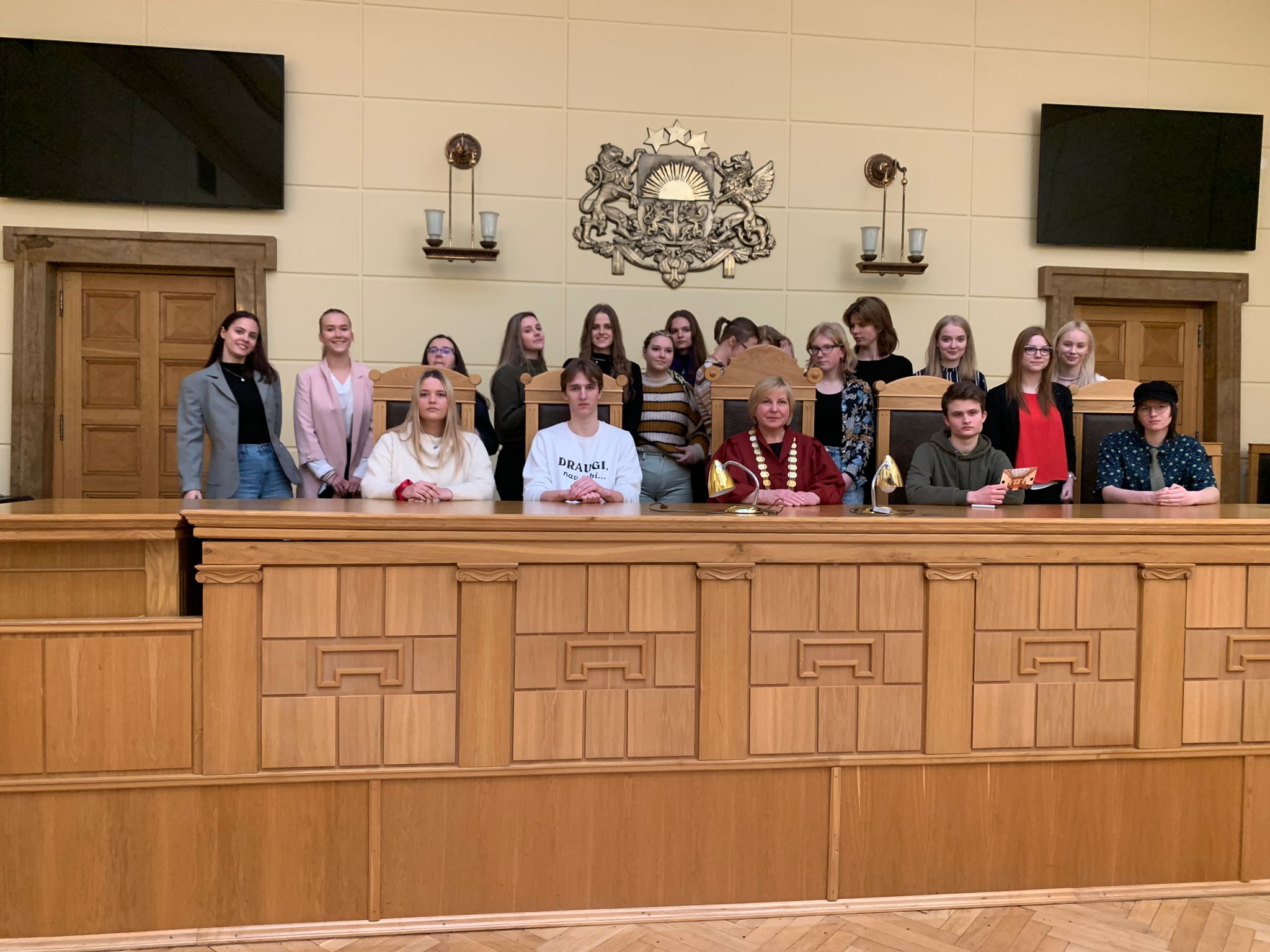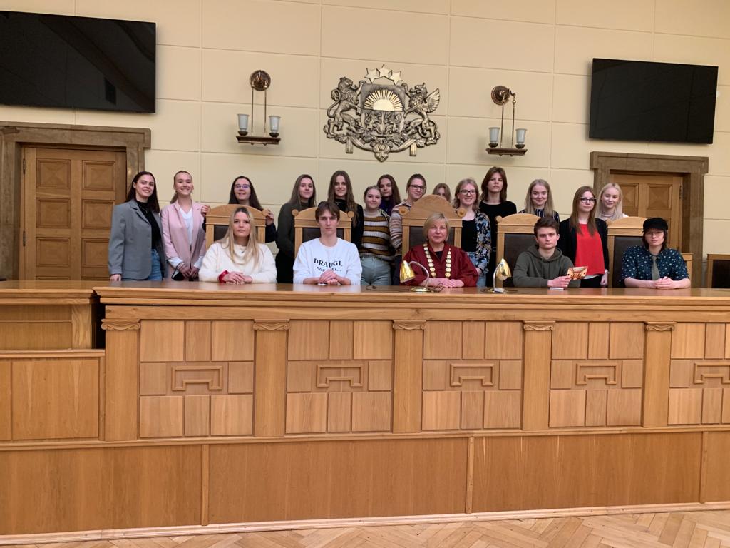 Kad ieradāmies Tiesu pilī, kur atradās Senāts, Ministru kabinets un citas valsts iestādes, nolikām nevajadzīgās virsdrēbes garderobē, izgājām caur policijas kontrolpunktu, uzrādot savus personu apliecinošos dokumentus, un devāmies uz mums priekšā esošo 1. stāva tiesas zāli. Ieņēmām vietas un divas tiesas darbinieces uzaicināja mūs aizpildīt aptauju par tiesu, tās darbību un mūsu zināšanām par to, kuras rezultātus rādīja uz lielā ekrāna zāles priekšā. Pēc brīža ieradās Veronika Krūmiņa, senatore jeb Augstākās tiesas tiesnese, kura mums vairāku stundu garumā parādīja prezentāciju un novadīja aizraujošu lekciju par Latvijas tiesu sistēmu un tās likumdošanu. Daļu no šī jau bijām apguvuši sociālajās zinībās vai Jauno Juristu skolā, taču bija noderīgi saņemt kondensētāku, padziļinātāku atskatu, kā arī analizēt dažādus īstus tiesu spriedumus iz dzīves — kāpēc tika pieņemts tieši tāds lēmums, kāds tika pieņemts, un kas to pamato. Lekcija beidzās, un mēs sadalījāmies divās grupās. Mūsu grupa devās lejā uz ēkas bumbu patvertni, kas bija iekārtota kā muzejs ar dažādiem artefaktiem, kas savākušies laika gaitā. Kā piemēru var minēt apsūdzēto restes, kas agrāk ierobežoja tos tiesu zālēs, bet pirms dažiem gadiem tika izņemtas Eiropas Cilvēktiesību tiesas sprieduma dēļ, kas šādu praksi atzina par nehumānu.