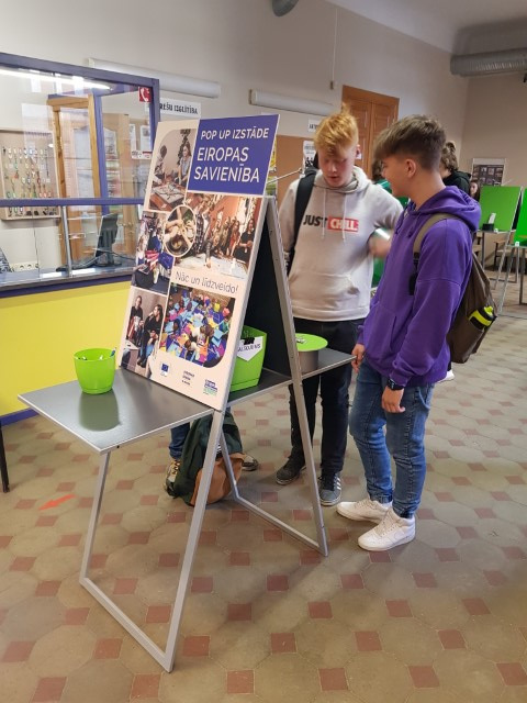 18.aprīlī Valmieras Valsts ģimnāzijā ar Eiropas Komisijas pārstāvniecības Latvijā atbalstu norisinājās POP UP izstāde “Es esmu Eiropas Savienība!” un “Prāta spēles”. Ikviens varēja piedalīties izstādes eksponātu veidošanā, balošanā par labākajiem eksponātiem, padziļinot izpratni, aktualizējot savu pieredzi un zināšanas par izstādes tēmu – Eiropas Savienība.