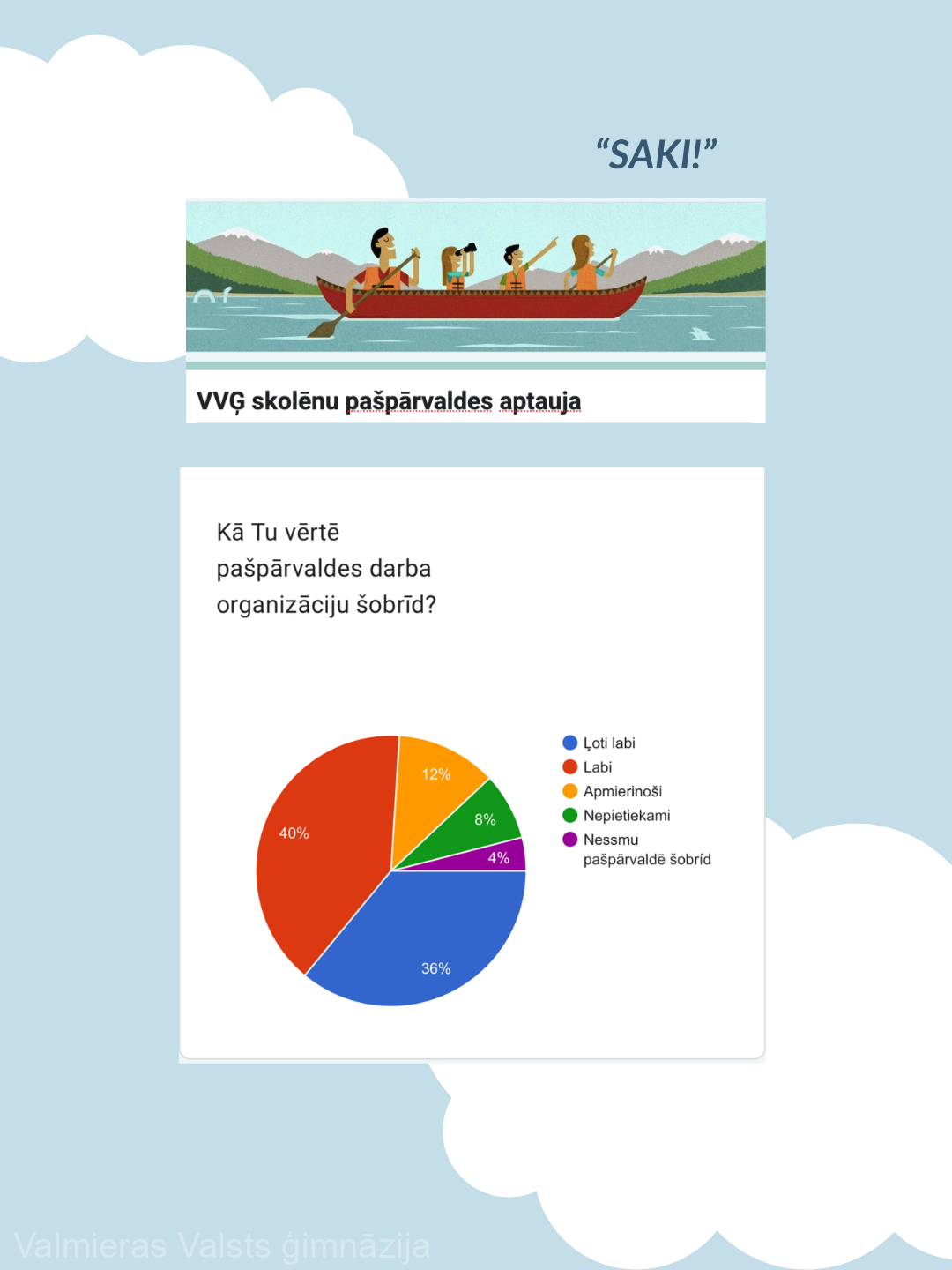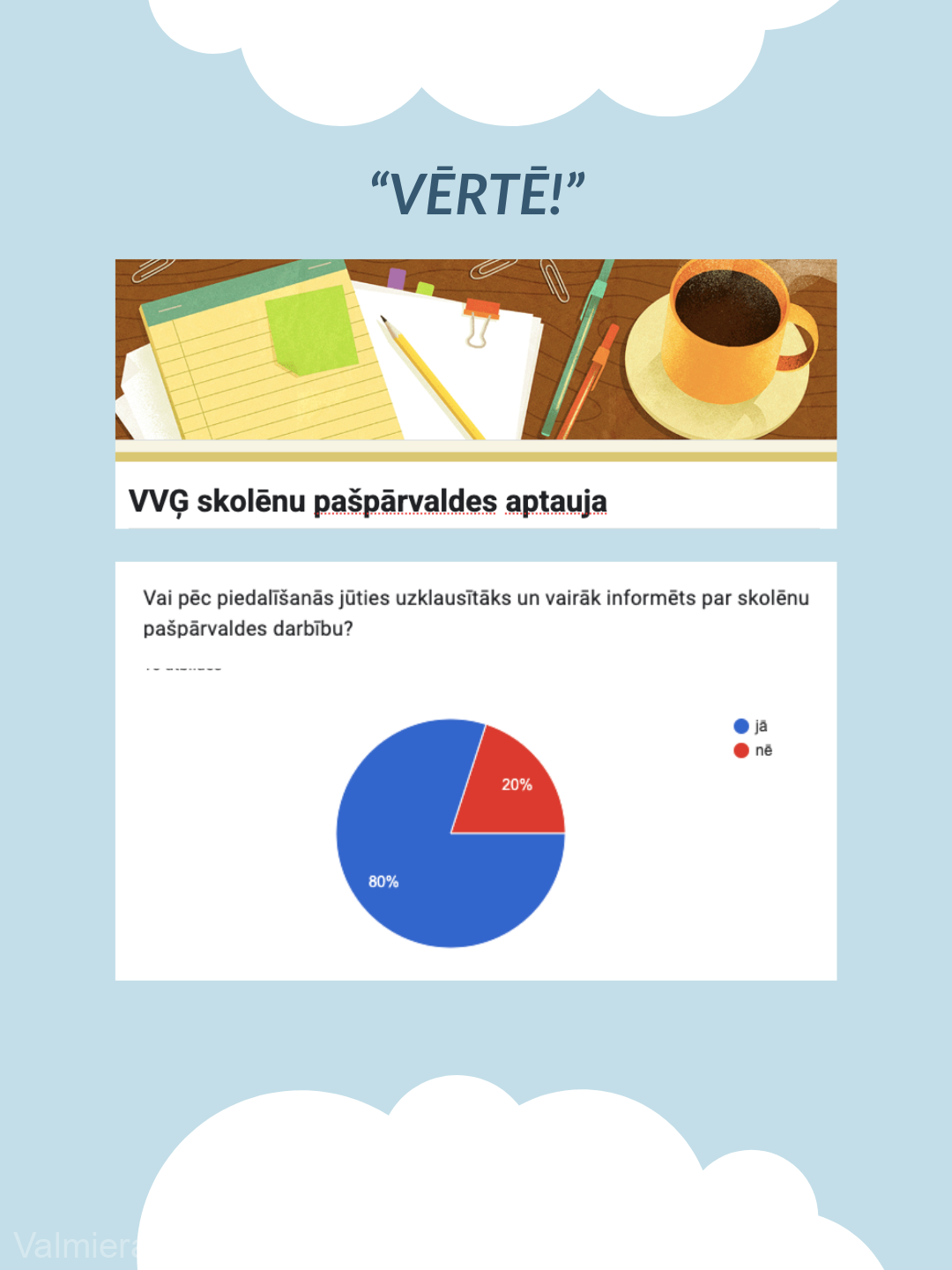 Lai noskaidrotu skolēnu vajadzības un viedokļus par pašpārvaldes darbu un telpu kvalitāti, izveidojām anonīmu aptauju. Tā palīdzēja saprast gan pašreizējo situāciju, gan turpmāk veicamos uzlabojumus.