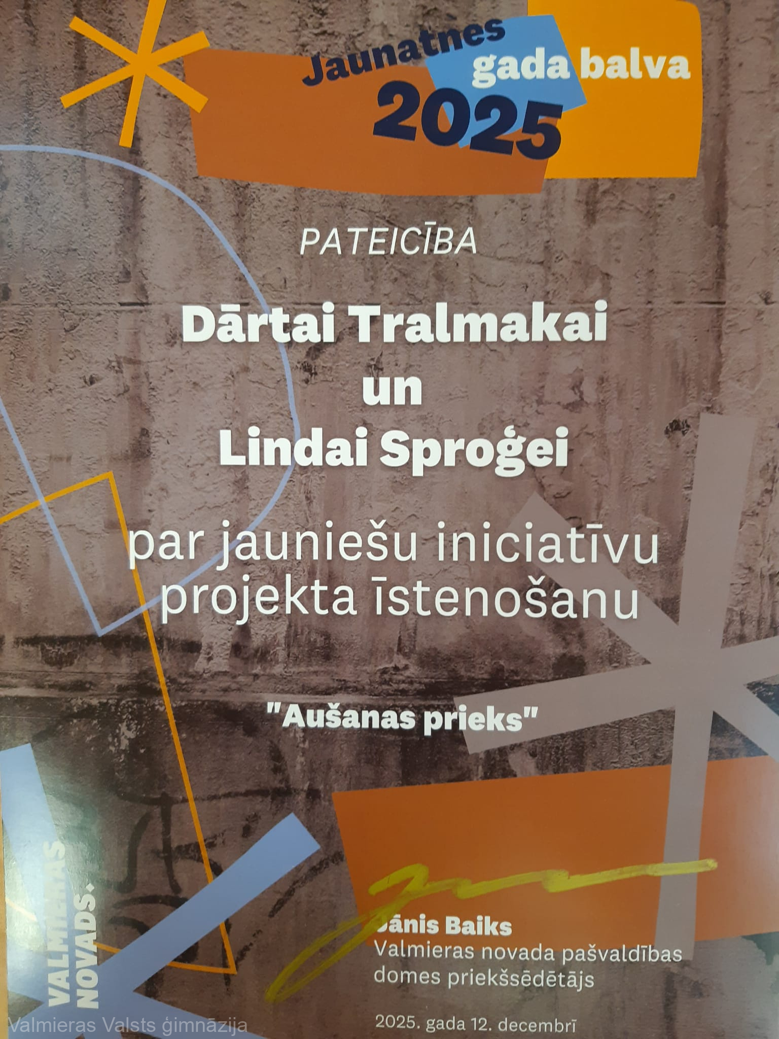 Projekts „Aušanas prieks”, tika īstenots Valmieras novada pašvaldības organizētā jauniešu iniciatīvas projektu konkursa ietvaros.